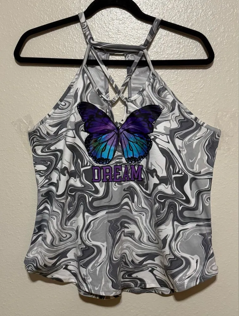 Make a statement with this Dream Butterfly halter tank top, featuring a striking gray and white marb... Show more