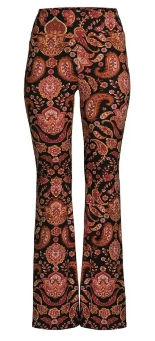 Women's flare pants in a vibrant paisley print. These pull-on pants feature a comfortable high waist... Show more