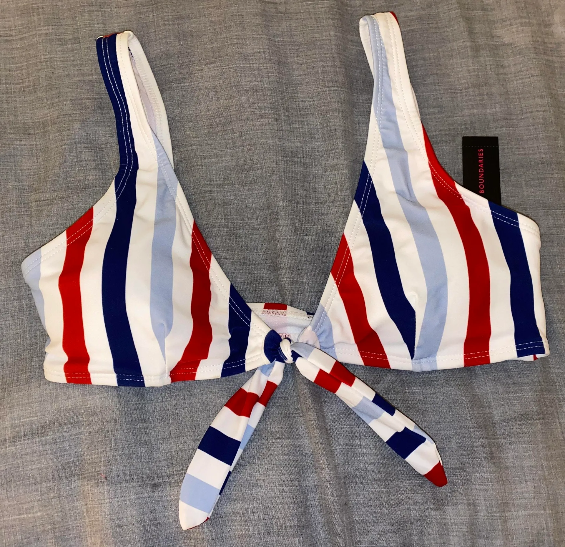 Striped bikini top with tie detail. Perfect for 4th of July!! Adjustable front tie, has padding, & s... Show more