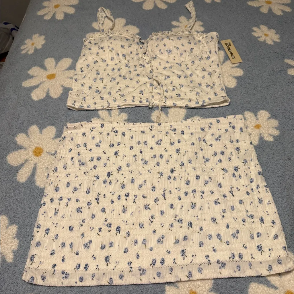 Elegant skirt with delicate blue floral design on a white background. Ideal for casual wear.