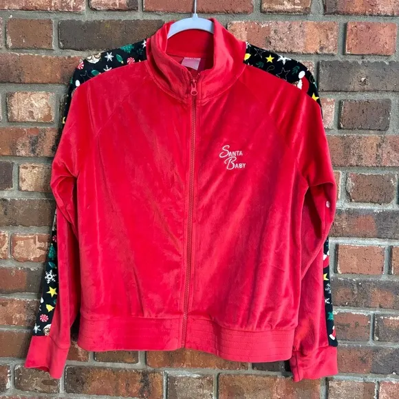No Boundaries womens juniors velour Christmas holiday party cats track jacket red L(11-13). Good pre... Show more