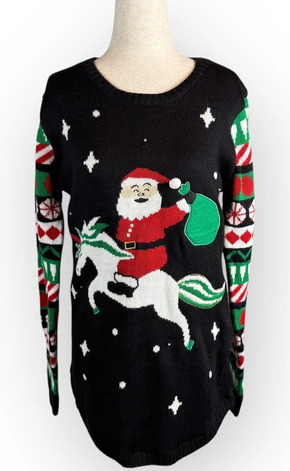 Women's ugly Christmas sweater, Santa riding a unicorn. Lights up!! Takes two button batteries. Size... Show more