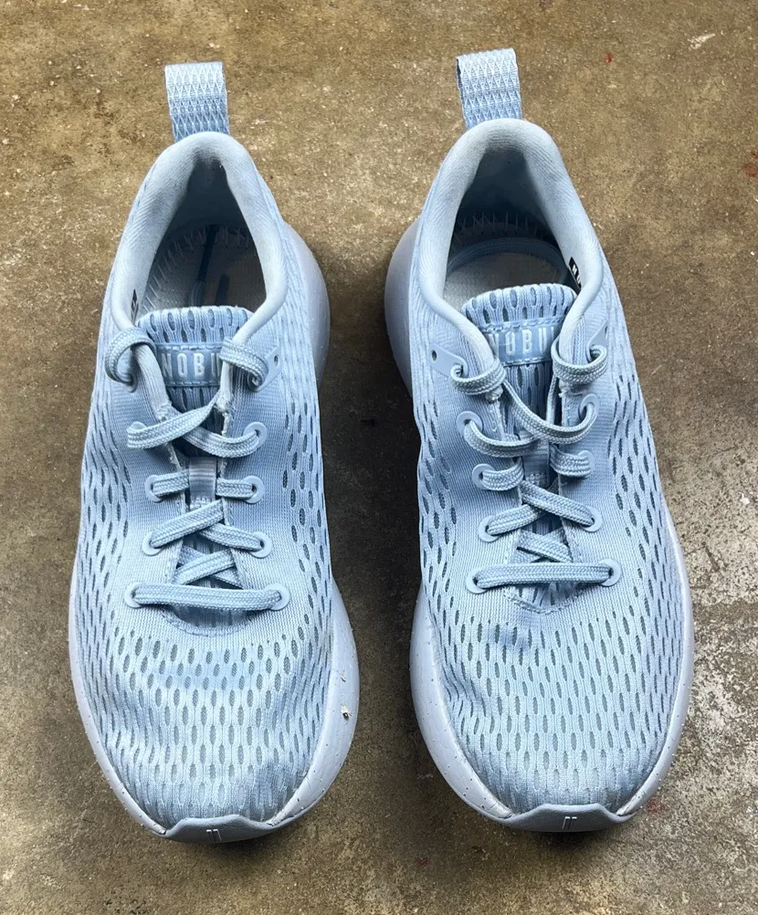 Sleek sky blue sneakers with durable construction. Ideal for workouts and everyday wear. Note: There are a couple of stains, shown in pictures. Shoes are still in good durable condition. No insoles included.