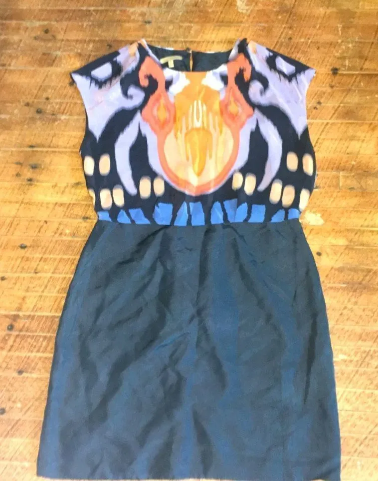Nocturne luxe, business casual, artsy, elegant, silk dress with zipper in the back. In good, used condition. Approximately 20 inches from armpit to armpit, 16 inches across the waist, 36 inches long. From a pet and smoke free house. Happy to bundle!