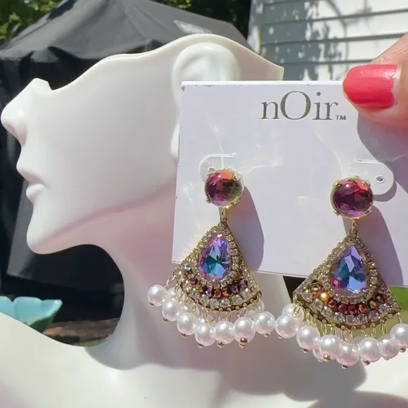 100% reliable, 5 star seller Poshmark Ambassador Shop my closet and make me a fair offer remember Poshmark takes 20%! New in box with tag Same day shipping Smoke and pets free Noir gold tone tear drop colorful reflective triangle pearls tassel earrings diamonds paved Add a touch of elegance to your outfit with these beautiful Noir tassel earrings. The triangular shape of the earrings features a stunning teardrop-shaped colorful pearl in the center, surrounded by smaller pearls that reflect light beautifully. The secure lock back closure ensures that these earrings stay in place all day, making them perfect for any occasion. The multicolor design of the pearls adds a unique touch to any outfit, while the white/colorless main stone shape complements any skin tone. These earrings are perfect for anyone who wants to add a touch of glamour to their look.