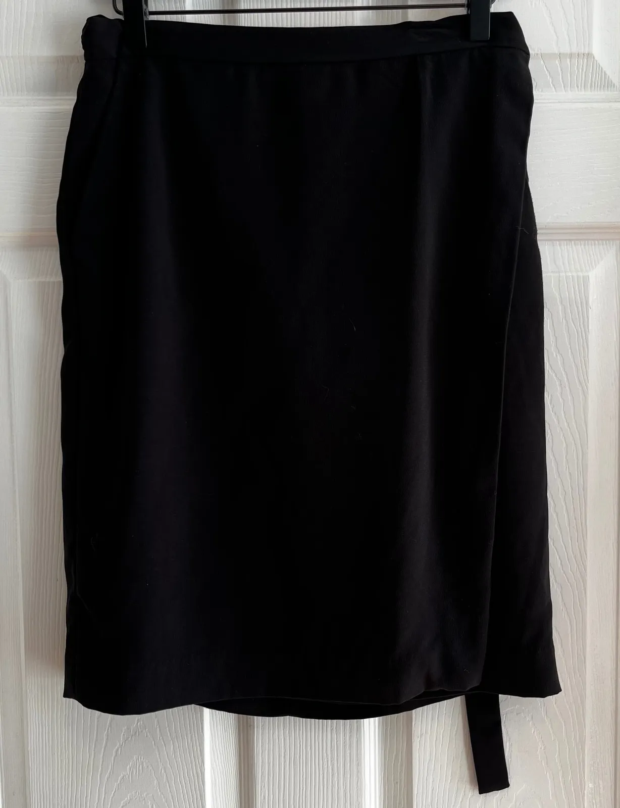 This skirt features a unique wrap-around style, offering an adjustable fit and a touch of contemporary flair. An integrated belt accentuates the waist, creating a polished and refined look. Keywords: wrap skirt, black skirt, belted skirt, business skirt, career skirt, professional skirt, office wear, casual skirt, knee length skirt, work skirt, classic skirt, minimalist skirt Thanks for Looking!
