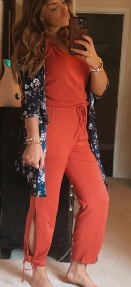 Orange spaghetti strap, casual romper jumpsuit Size small I am 5’4 roughly 145 pounds and this fits me well but a little tight for reference Adjustable straps with pockets and a cinched waist line that is adjustable. The bottom of the pants have a slit that goes up the calf with a knotted adjustable tie. Super stretchy, soft material Only getting romper with purchase If you would like to purchase the floral American Eagle top that is with it I do have it listed in my store front and will bundle both together