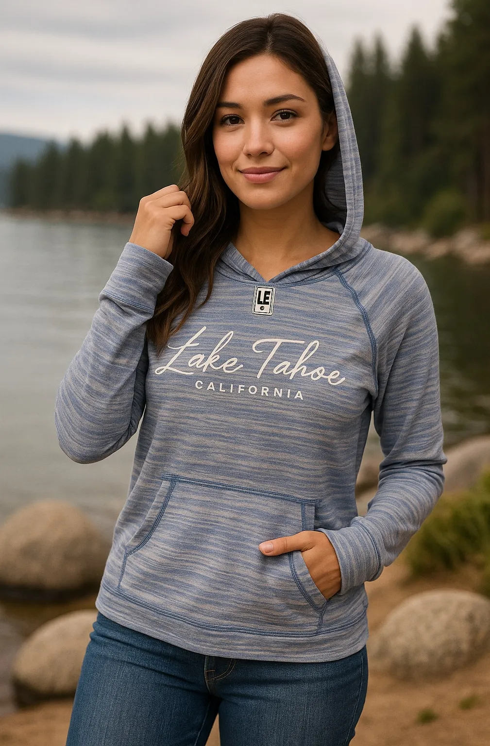 BRAND: L.E. SIZE: Women’s Small COLOR: Blue & White Striped MATERIAL: Soft Knit Blend (likely cotton/polyester based on texture) CARE INSTRUCTIONS: Machine wash cold, tumble dry low (assumed standard care) Stay cozy and casual in this lightweight striped hoodie featuring a “Lake Tahoe California” graphic across the chest. The relaxed fit, kangaroo pocket, and soft knit material make it perfect for layering on breezy days or cool summer nights. Whether you’re lakeside, camping, or just keeping it casual, this hoodie adds a laid-back coastal vibe to your look. Gently pre-loved and ready for a new adventure. Measurements (flat lay, approx): • Pit to Pit: 18 in • Length: 25 in • Sleeve: 24 in Condition: Excellent pre-loved condition, no major flaws noted. Model photo and video are AI-generated.