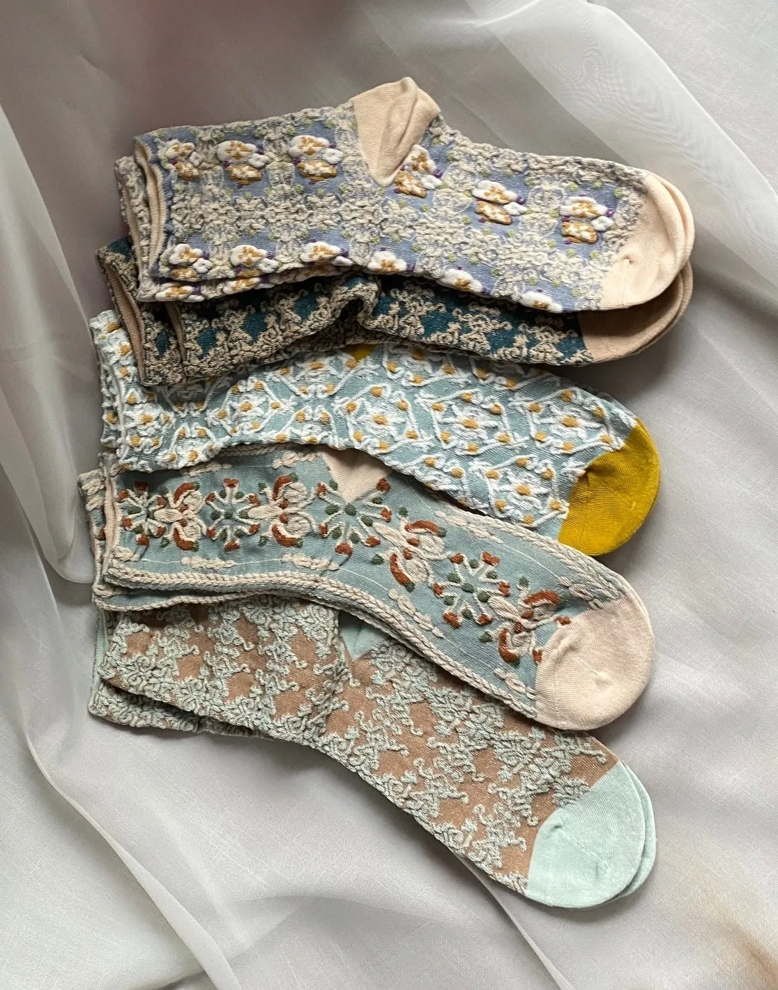 Brand new collection of five pairs of women's crew socks featuring delicate vintage floral lace patterns and a mix of pastel colors including blue, yellow, pink, green, white, and brown. Each pair showcases unique intricate floral designs. Material is a cotton modal blend. Style: Crew Socks Theme: Mandala, Leaf, Art Sock Length: Mid Calf Material: Blended Fabric, Cotton Blend, Microfiber Type: Socks Department: Women Pattern: Floral Features: Breathable Season: Spring, Summer, Fall Opacity: Semi-Sheer Number in Pack: 5 Pairs Occasion: Everyday, Casual Toe Style: Full Toe edwardian, cottagecore, granola, floral lace, crew socks, women's socks, cute socks, kawaii socks, pastel socks, vintage style, lace socks, butterfly socks, feminine socks, dainty socks, ornate socks, everyday socks