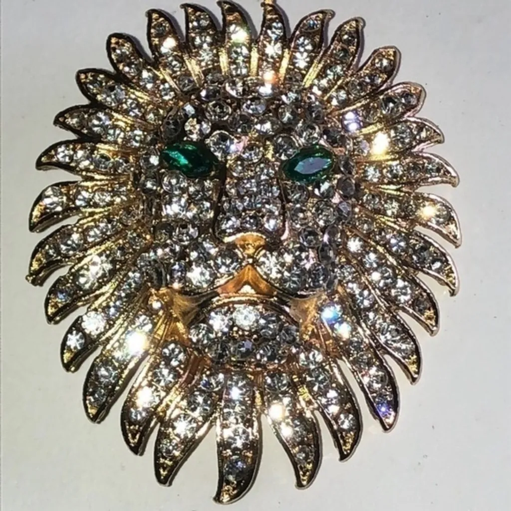 Gold Tone CZ Rhinestones & Green Rhinestone Eyes Lions Head Brooch Shoulder Pin - $28 - From Vault