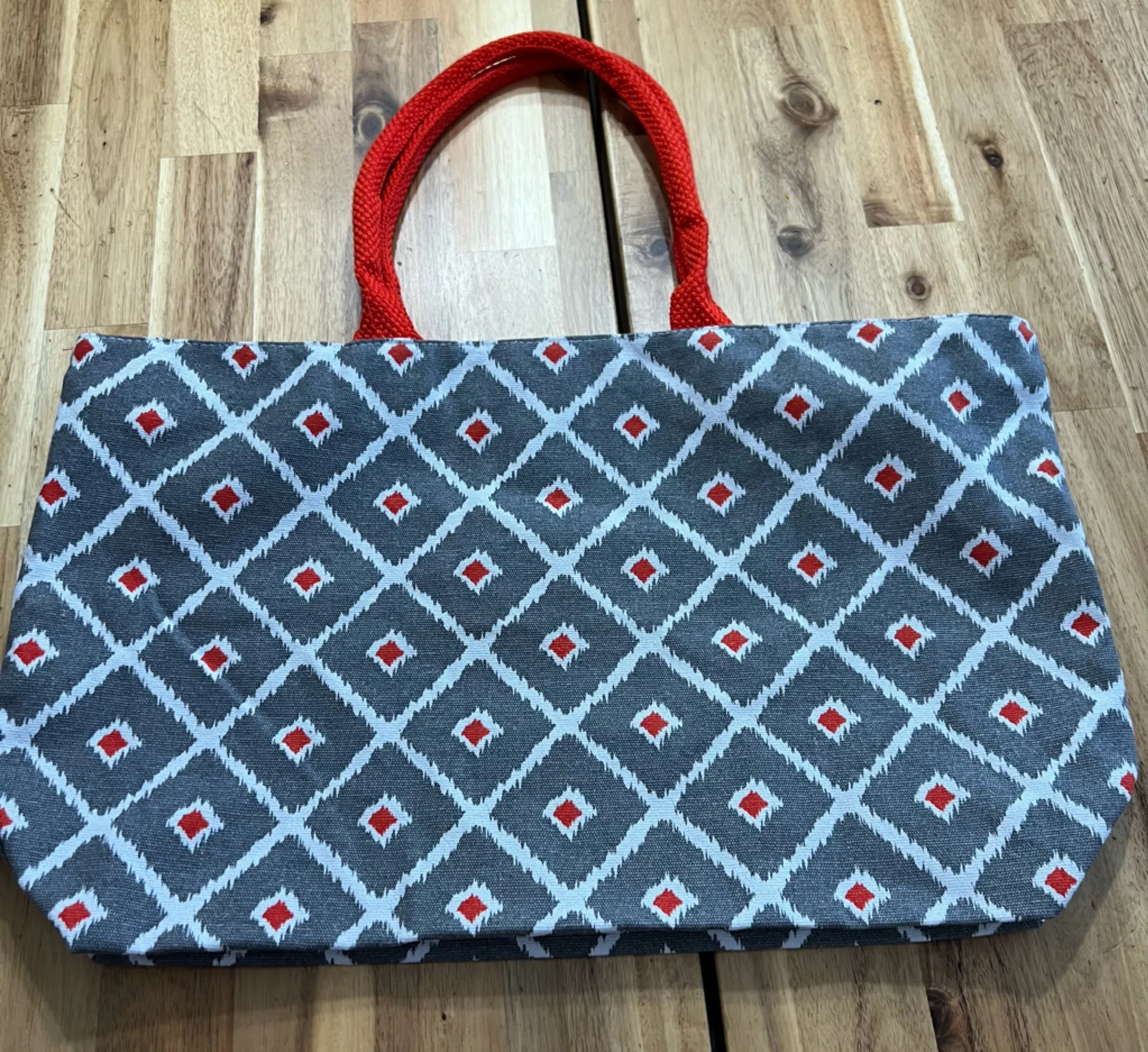 Stylish fabric tote bag featuring a gray geometric diamond pattern with red accents and bold red woven handles. Fully lined interior with a top zipper closure to keep belongings secure. Lightweight yet sturdy—perfect for everyday errands, work, books, crafts, or as a reusable shopping bag. ✔ Gray geometric print with red details ✔ Red woven carry handles ✔ Top zipper closure ✔ Lined interior ✔ Lightweight & reusable Condition: Good pre-owned condition • No rips or holes • Zipper works well Brand: Unbranded / Handmade (no brand tag) tote bag, canvas tote, geometric bag, reusable shopping bag, zipper tote, everyday bag, handmade tote, casual carryall, market bag
