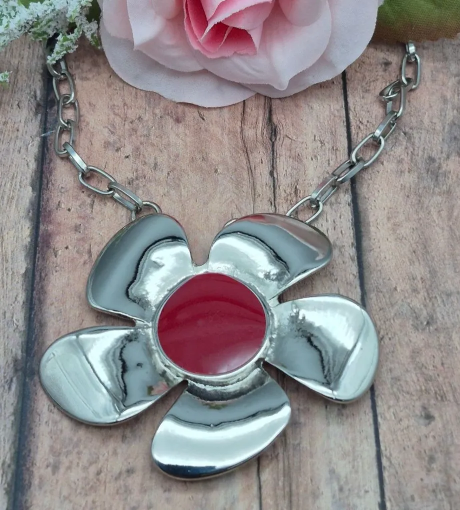 Add some fun to your style with this pull-over necklace featuring a captivating large silver tone & red enamel flower. Perfect for any occasion, it embodies the essence of flower power and hippie vibes. • Large silver tone pendant • Red enamel flower center • Pull-over design • Statement piece • Flower power aesthetic Size: Unisex 32" Condition: Pre-Owned Like New Excellent Condition Thanks for looking at my listing. I have been selling online for several years and take pride in the items that I am listing and feel they will make a great addition to someone's wardrobe or home. Check out my other items to save on shipping! Please feel free to ask any questions you might have we are happy to answer 🙂 Happy Shopping! #419
