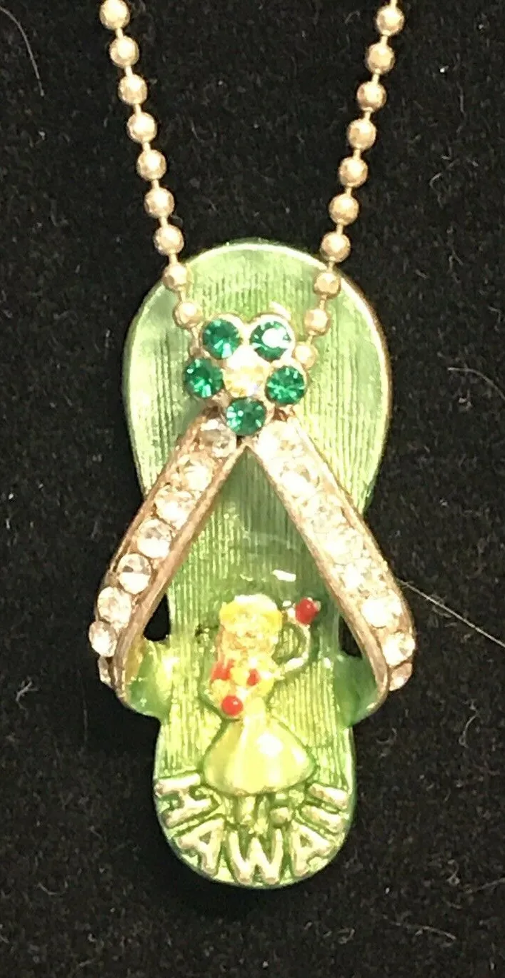 Hula Girl BRAND: MC (Stamped) SIZE: One Size COLOR: Green/Gold with Multicolor Accents MATERIAL: Enamel, Rhinestones, Metal Alloy CARE INSTRUCTIONS: Wipe clean with soft cloth Add a touch of island charm with this vintage Hawaii souvenir flip flop pendant necklace. The pendant features a sparkling rhinestone strap with green gem accents, a detailed hula girl in the center, and “HAWAII” engraved at the base. Gold-tone chain included. Marked MC on the back, a collectible souvenir jewelry maker. Perfect for summer vibes, tropical vacations, or as a fun statement accessory for your jewelry collection. Measurements (approx): Pendant: 1.5 in length Chain: 18 in drop Condition: Excellent pre-loved condition, no major flaws noted. Model photo is AI-generated