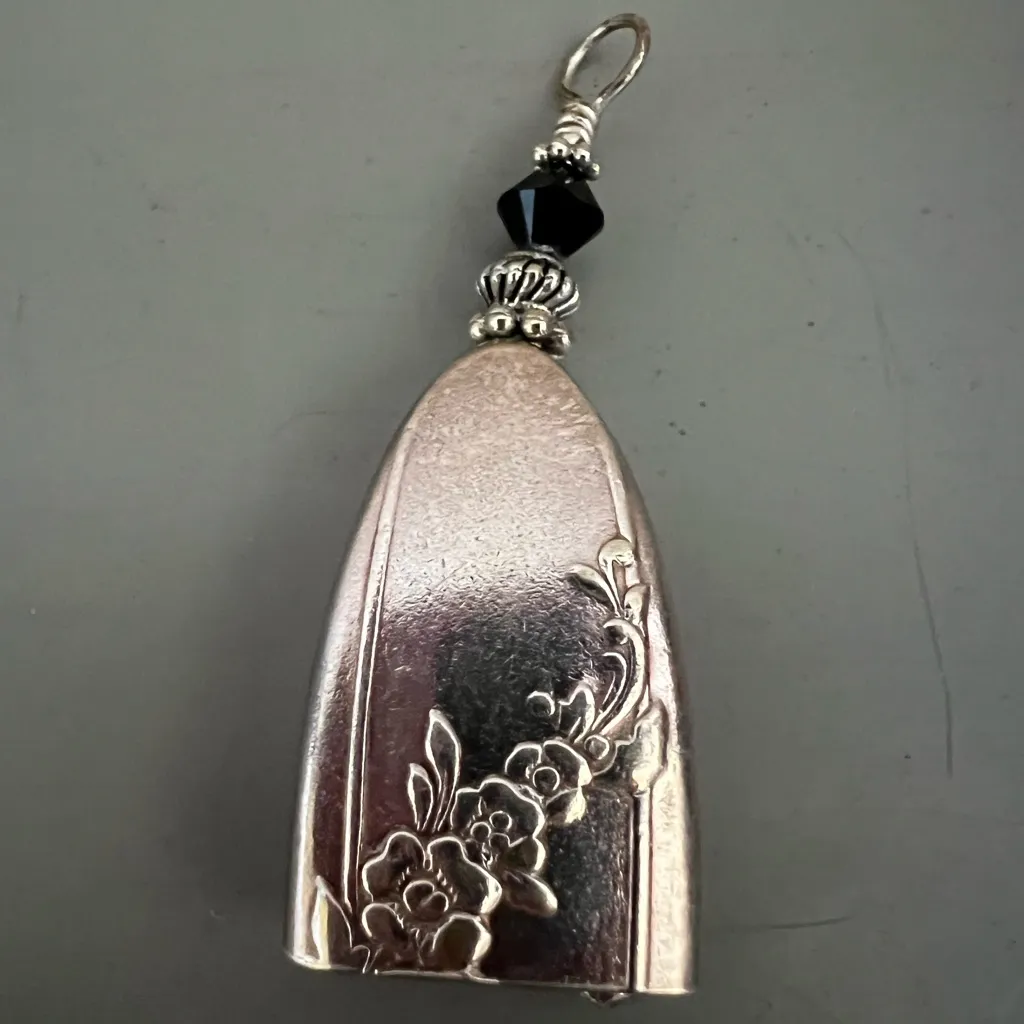 πΏ Crafted from a repurposed silver knife handle, this pendant is a striking blend of antique charm and artisan creativity. Featuring an ornate floral design and accented with a faceted black bead and silver-toned spacer, itβs perfect for anyone who loves unique, handcrafted jewelry with a story. β¨ Details: β’ Handmade from a vintage silver knife handle β’ Elegant floral embossing with curved silhouette β’ Black faceted bead + silver spacer for added flair β’ Loop at top for easy chain attachment β’ Ideal for layering or wearing solo