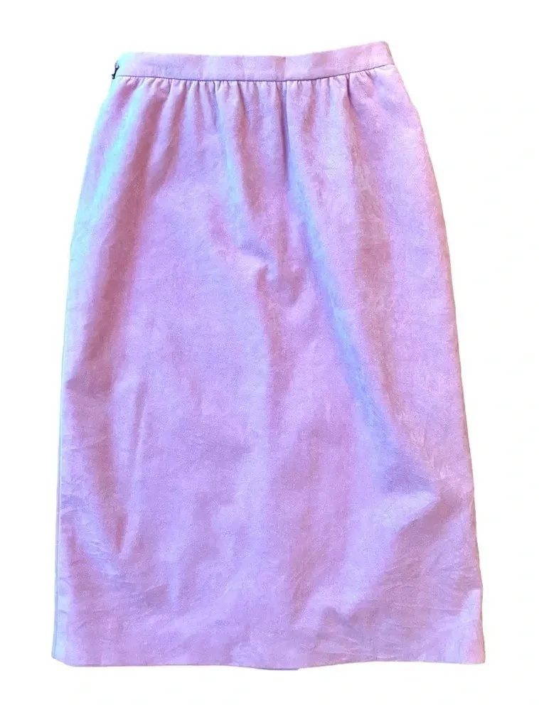 Vintage Ultrasuede Baby pink pencil skirt Midi length Fully lined Pockets, slit in back In excellent vintage condition Size not marked, appears to be small 13.5” across waist, 28” length, 12” slit Tags: Barbie, Barbiecore, retro, vintage, vegan suede, fall