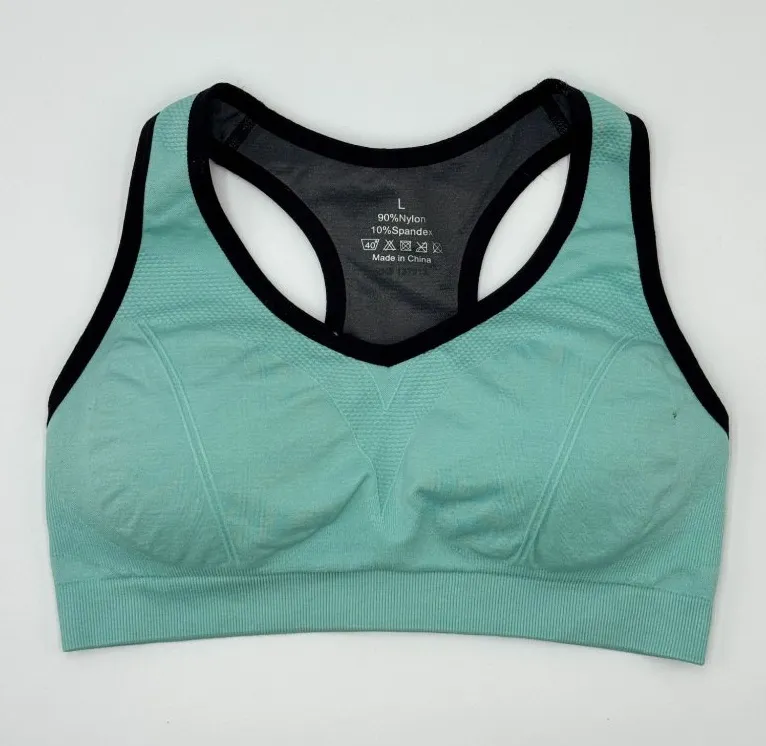This racerback sports bra, crafted with a blend of nylon and spandex, offers a supportive and breathable fit. Its mint green fabric with contrasting black accents highlights its sleek design. Designed for comfort during physical activities, it features a removable padded interior and a secure elastic band to ensure a snug fit. • Racerback design for enhanced mobility • Removable padding for customizable support • Secure elastic band for stability • Stretchable nylon-spandex blend • Lightweight and breathable fabric Top to bottom = 11 inches Side to side = 12 inches