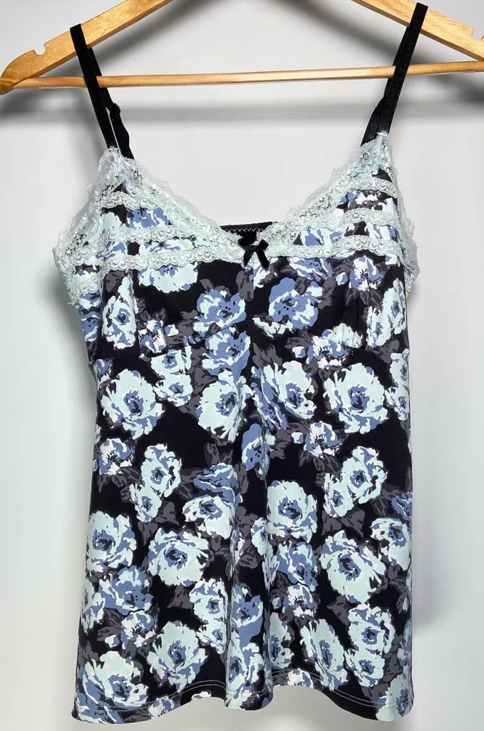 Y2K Floral Lace Trim Cami Black Blue Whimsigoth Cottagecore Fairy Flirty Rose Size M(no size but m... Show more