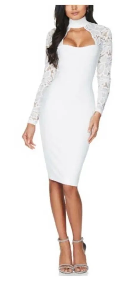 Nookie Lady Lace Long Sleeve Midi Dress | SMALL Revolve Brand New With Tags Details Gorgeous long sleeve bodycon dress with amazing lace sleeves and collar. Finishing just below the knee this dress comes in our scuba crepe fabric fully lined with invisible zip at back PROUDLY DESIGNED AND MADE IN AUSTRALIA Color: White Size: SMALL Tags: Wedding, Brides, Bachelorettes party, Wedding Rehearsal dinner, Honeymoon, Evening Gown, Formal, Homecoming, Prom, Party, Holiday, Elegant, Preppy, Sophisticated, Sultry, bodycon,
