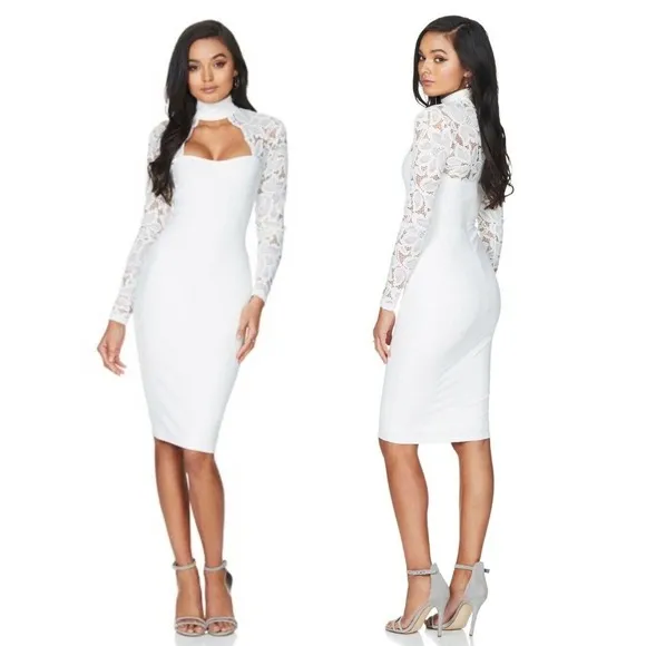 New with tags, no flaws. Size: XS Measurements: 12" flat across chest, 42" long Material: Nylon, Polyester, Spandex Stretch: Yes Care: Hand Wash or Dry Clean Closure: Zip Style Notes: Floral, Back Zipper Closure, Choker Neckline, Front cutout, Fully Lined, Fitted Tags: Casual, Wedding, Date, Business Casual, Party, Sexy, bridal, lace, bridal shower, rehearsal dinner, bachelorette