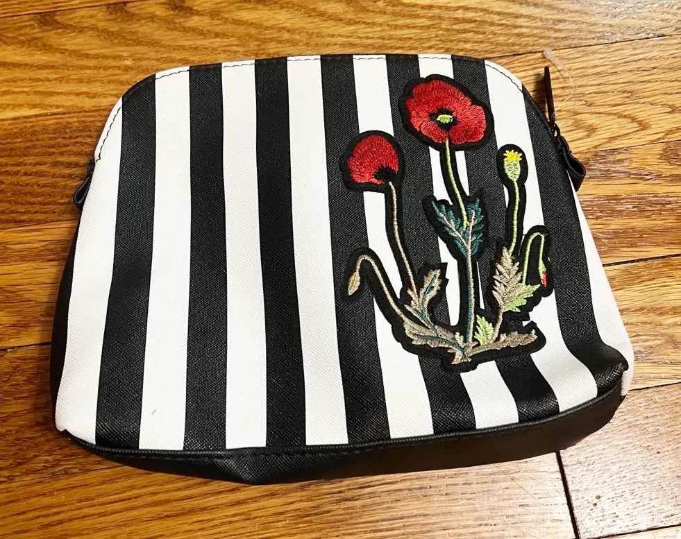 New without tag- small mark near bottom. Black and white striped. Red floral embroidery. Zip top. Op... Show more