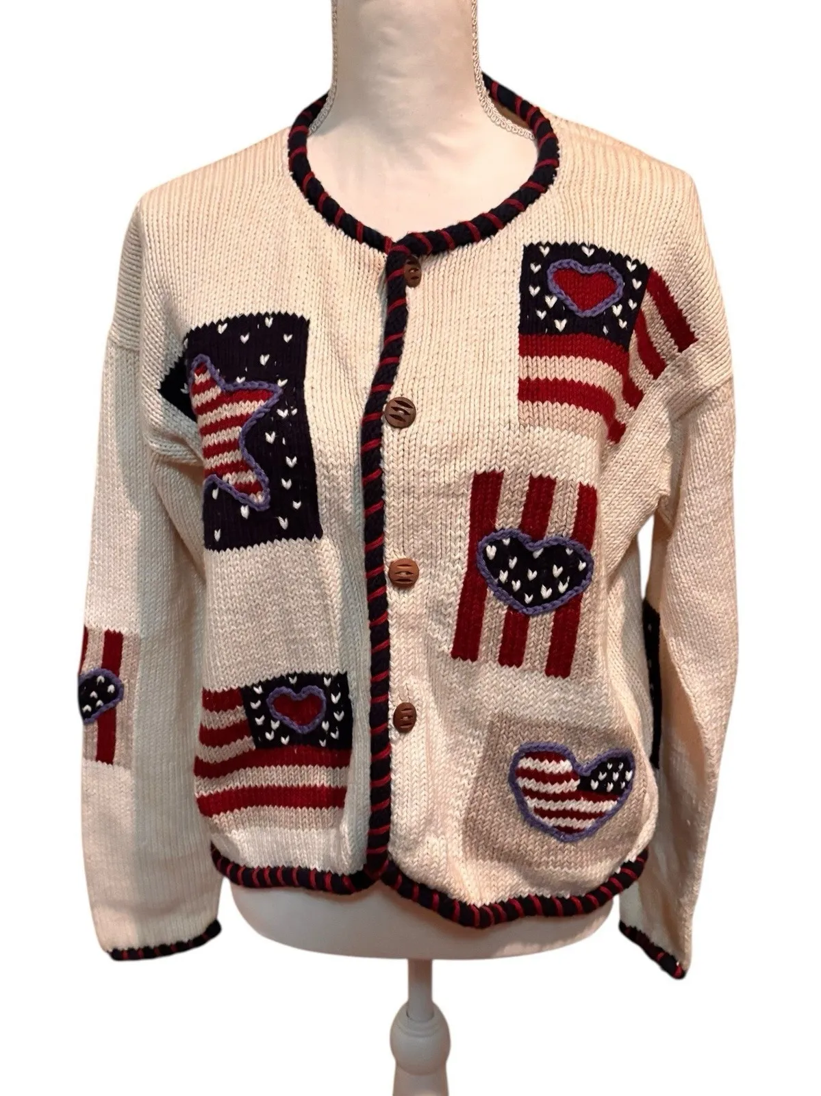 vintage Brand: Norm Thompson • Size: Medium Armpit to armpit 23 inches Length 21 inches • Style: Button-front cardigan • Neckline: Rounded collar • Long sleeves • Patriotic / Americana folk-art motif • USA flag and heart designs on front and sleeves • Large star graphic on back • Wooden-style buttons • Rope-style contrast trim 100% Cotton • Made in Bolivia