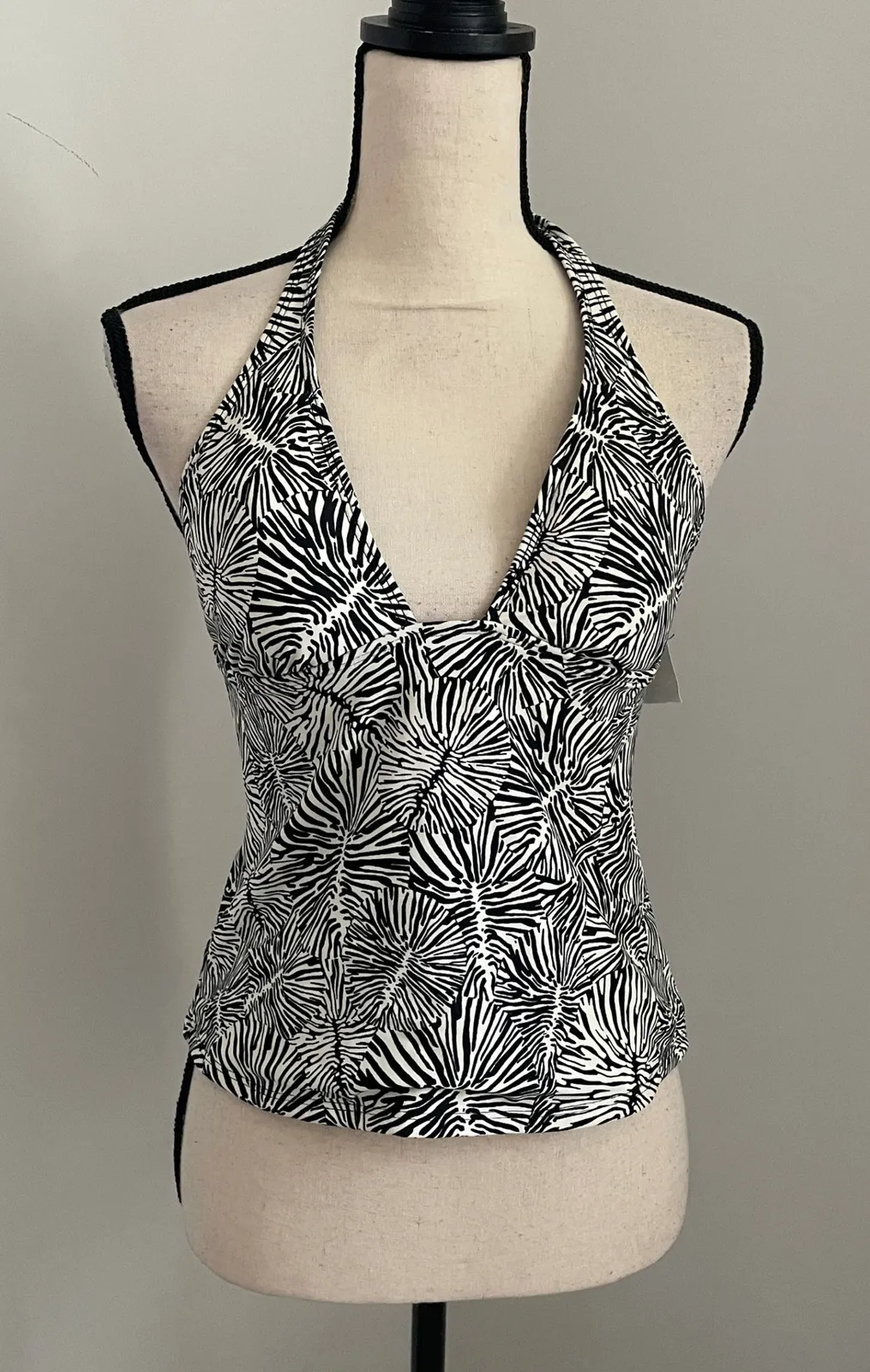 Norma Kamali halter tankini swim top in black and white zebra print. Designed with a plunging V-neckline and adjustable halter ties for a customized fit. This stylish tankini is perfect for beach vacations, pool parties, or a tropical getaway. Measurements: • Bust: 17 in • Length: 20 in Type: Tankini Department: Women Theme: Tropical, Leaf Material: Nylon, Spandex Features: Adjustable Strap, Lined, Removable Pads Swim Top Style: Tank Pattern: Animal Print Strap Type: Halter Country of Origin: Dominican Republic Garment Care: Hand Wash Only Unit Type: Unit Keywords: Norma Kamali, tankini, halter, zebra print, plunging neckline, beachwear, poolside, tropical, vacation, resort, swim top, designer swimwear #beach #vacation #pool #zebraprint #travel NEW Zebra Print Halter Tankini Swim Top Size Medium V-Neck Resortwear Vacation