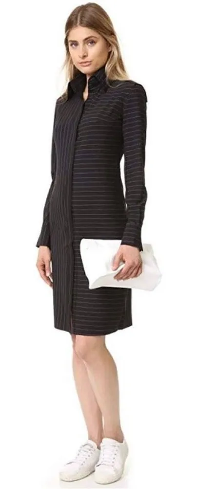 Norma Kamali Women's Shirt to Knee Dress in black with grey/ white pinstripe 68% Polyester, 28% Rayon, 4% Spandex Machine Wash Imported Collared Neck Slim Structured Fit Collared neckline with V-crow closure Knee length with front split. Raw hems throughout. Size 8 Excellent condition
