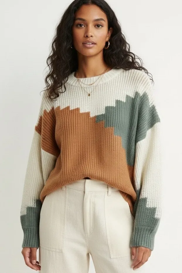 Chunky knit fabric Crew neckline Long balloon sleeves Ribbed cuffs and hem Colorblock pattern Soft textured feel Relaxed fit Approx. Measurements: Pit to pit: 24.5” Sleeve: 20” Length: 23” Cozy; Fall; Winter; Cottagecore; Colorful; Soft Girl; Scandinavian; Warm; Neutral; Boho