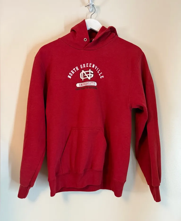 Great pre-loved condition. The hood has no strings. Official North Greenville University hoodie • Soft, comfortable fleece interior for everyday wear • Classic NGU colors and logo design • Durable stitching and quality fabric • Great for students, alumni, or supporters • Perfect for game days, workouts, or casual wear • Roomy front kangaroo pocket • Ribbed cuffs and waistband for a secure fit • Easy-care, machine-washable material Stay cozy and stylish with this North Greenville University hoodie. Perfect for casual wear, this red hoodie offers comfort and a classic look.