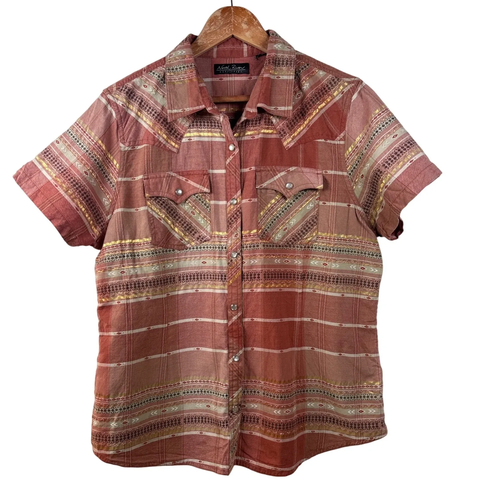 North River Outfitters women's short-sleeve western snap shirt designed in a soft red / paprika hue. The size tag is cut out but per measurements, this is likely a woman's large. Please view measurements prior to purchase. This shirt features a classic plaid pattern intricately woven with geometric and tribal-inspired striped accents, including subtle metallic gold threads for a touch of shimmer. The traditional western yoke detailing on the front and back adds to its authentic cowboy-inspired aesthetic, complemented by two button-flap chest pockets and pearlescent snap closures down the front and on the cuffs. The short sleeves and breathable fabric make it a comfortable and stylish choice for a variety of casual occasions. Excellent preowned condition with no flaws to note. Measurements: • Chest: 22 inches (armpit to armpit) • Length: 27 inches (shoulder to hem) Keywords: North River Outfitters shirt, women's western shirt, short sleeve snap shirt, red plaid shirt, geometric print shirt, tribal print shirt, country style clothing, boho western shirt, gold accent shirt, cowgirl style, button front shirt *From a smoke free home *Ships next business day