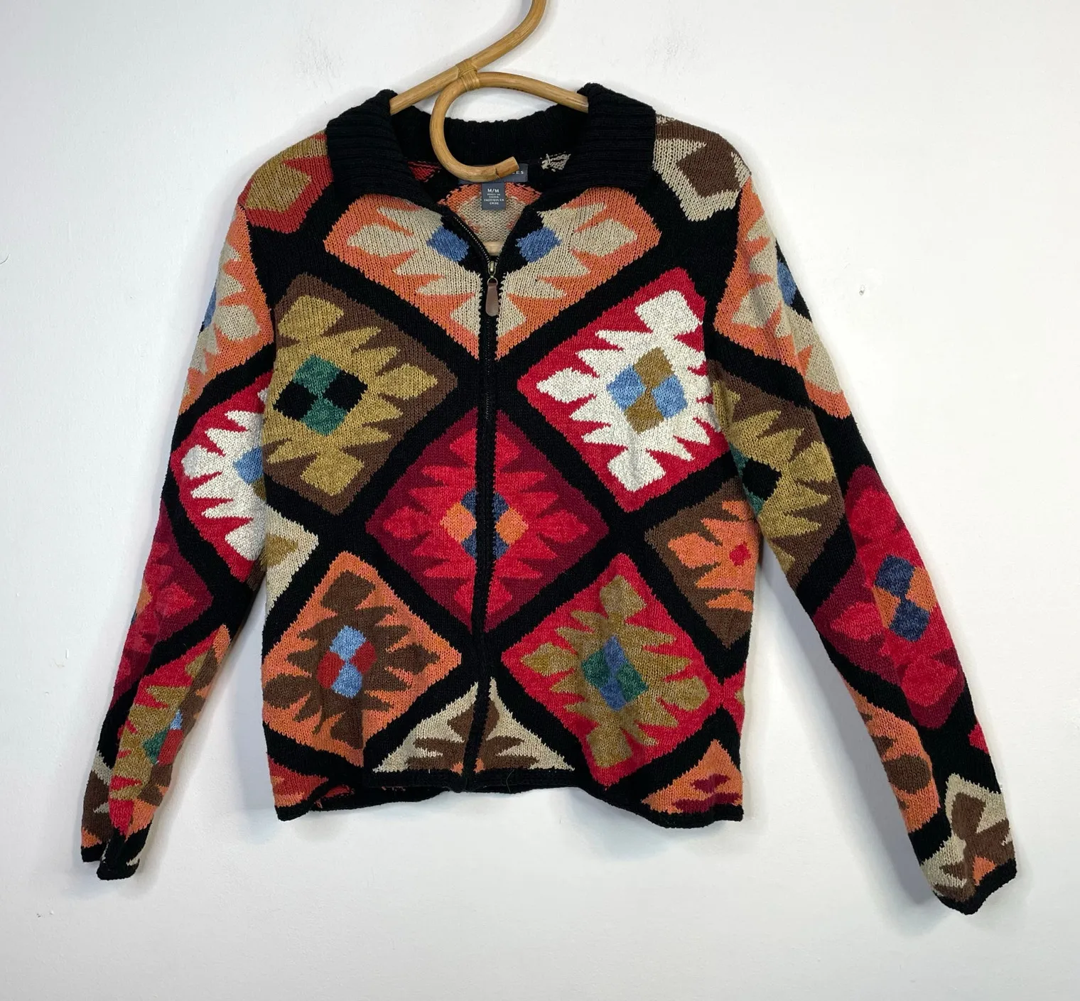 Northern Isles vintage early 2000s Southwest collared zipper cardigan, women’s size Medium (this runs a bit small, please check measurements carefully). In good pre-owned condition. Soft loose knit blend of 54% ramie 43% cotton 3% other fibers in a fabulous southwestern Navajo blanket pattern in black, red, blue, tan etc. Collared style with a full length front zipper closure. Long sleeves Crochet trim at cuffs and bottom hem Kind of a shorter, boxy fit Chest: 21” underarm to underarm Back: 16” shoulder to shoulder across back Sleeves: 23.5” Length: a bit over 23” Bottom hem: 20.5” across All measurements are approximate and were taken with the garment laid flat, fabric unstretched Smoke free home with pets Ladies retro classic western cowgirl Yellowstone mountain desert canyon textile art to wear coastal