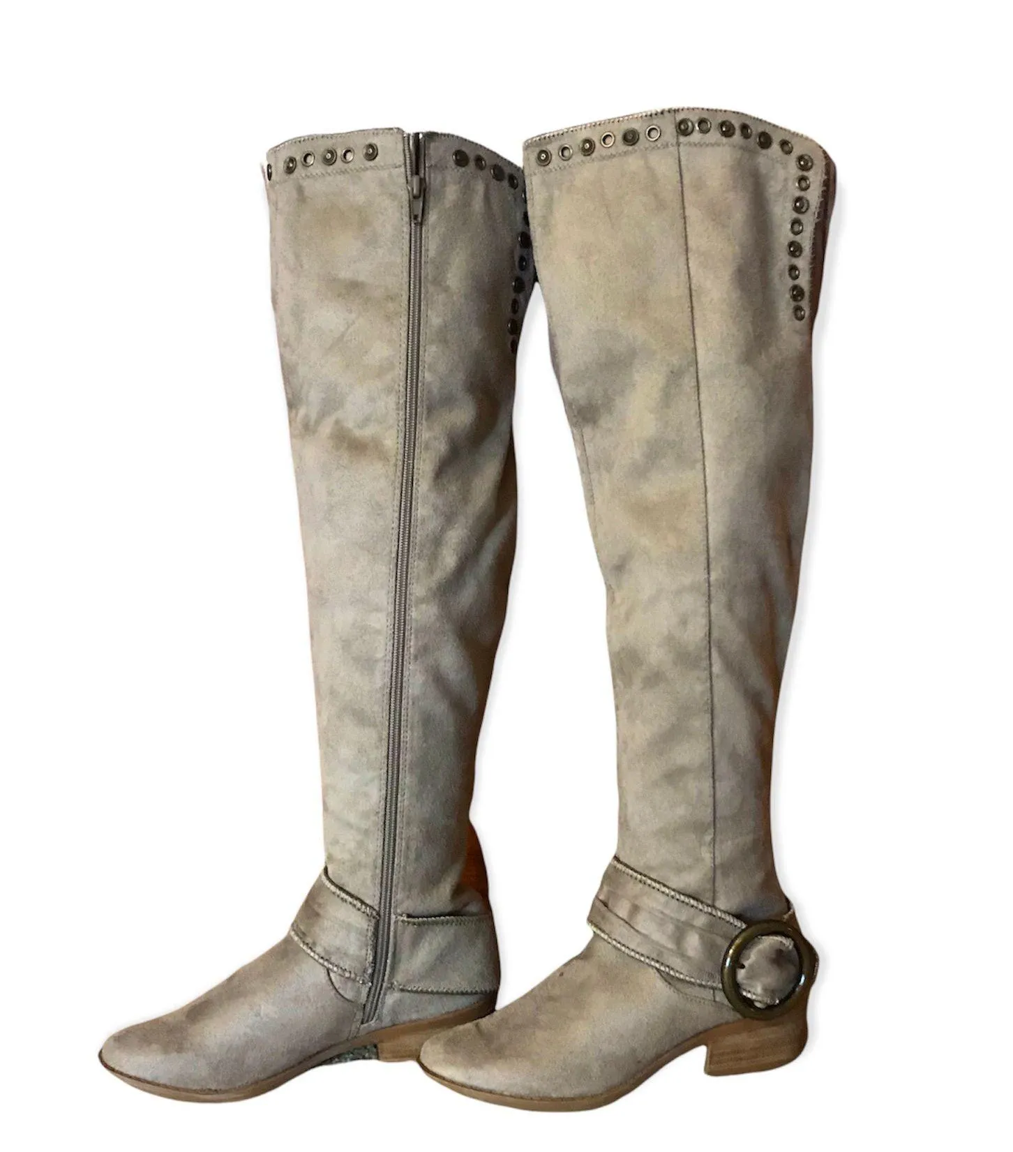 Not Rated-Belicia Over the Knee Boots-Featuring a slitted OTK upper highlighted by studs-Full zipper closure in back-Rubber sole w/1.5” heel-NEW-Sz 6 *Suede-like feel *Synthetic lining *Cushioned footbed *Molded block heel *Synthetic outsole *23” shaft height