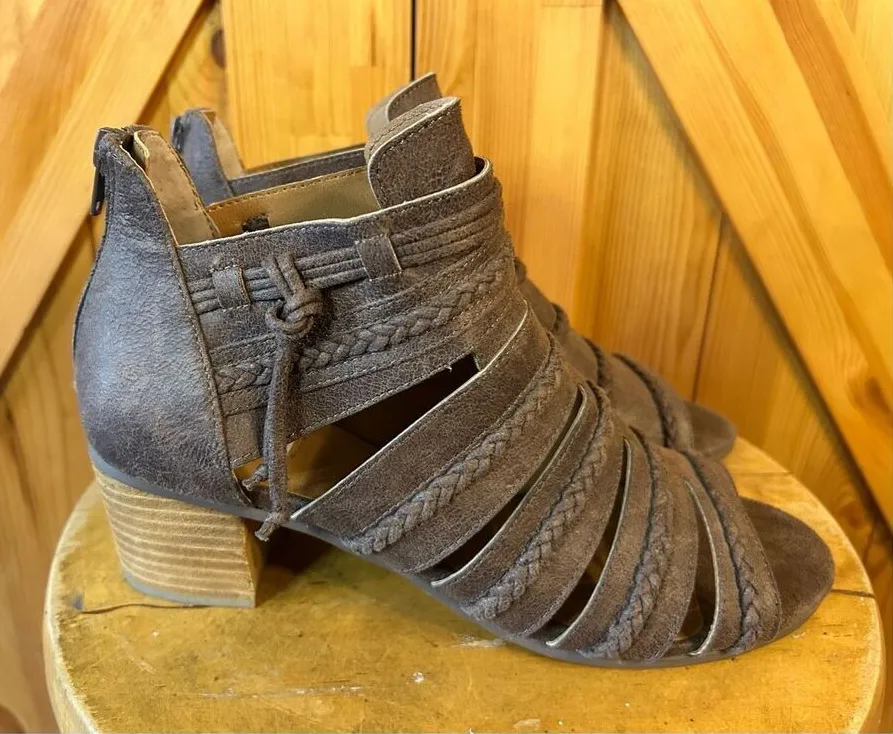Not Rated Strappy Heeled Sandal Boots 10 Faux Suede Brown Block Heel Back Zip - $31 - From Jessica