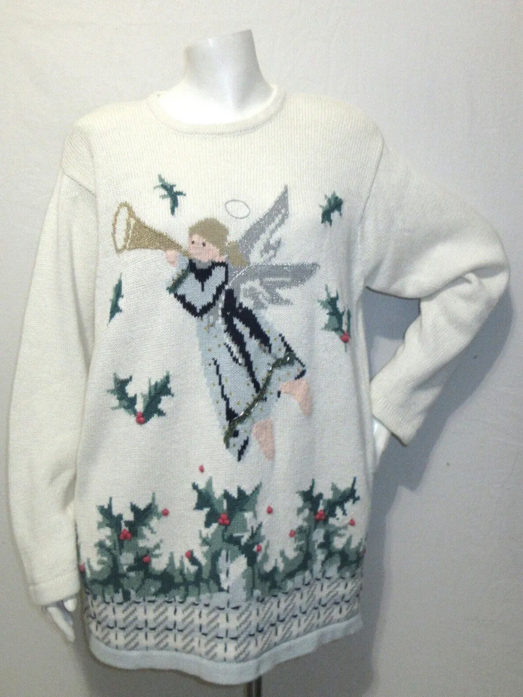 Elevate your festive wardrobe with the charming Ugly Christmas Sweater from The Villager, a perfect blend of holiday cheer and stylish comfort. Adorned with beaded accents and a delightful angel character, this white pullover sweater is a vintage treasure for anyone who loves unique winter clothing. It fits a size Large comfortably, with stretch material around the chest and hem for a flexible fit. Crafted from a soft cotton blend and ramie cotton, the sweater ensures warmth and durability during the cold season. The round neckline, collarless design, and long sleeves with shoulder pads add to its classic yet trendy appeal. Whether you're headed to the office or enjoying a casual outing, this knit piece is versatile for various occasions and machine washable for easy care.