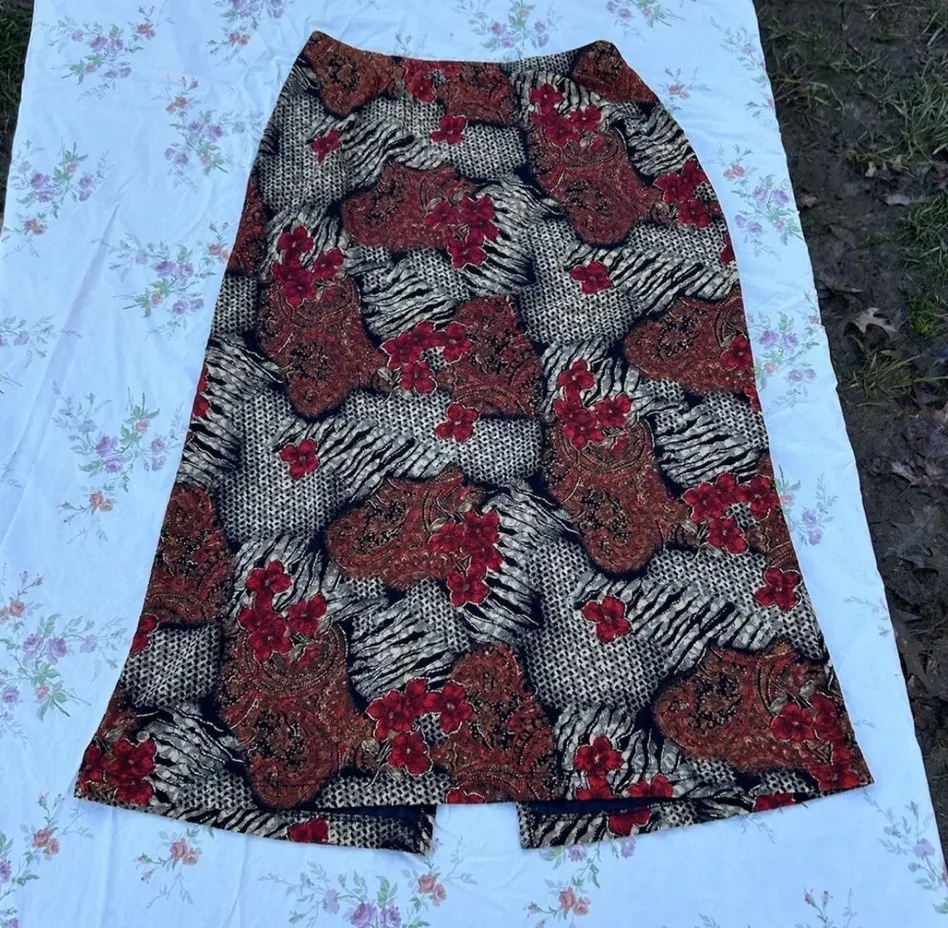 Notations skirt size petite large. Preowned great condition! Has florals, animal print, gold detailing, slit in back, very whimsy looking. Elastic in waistband, 53% acetate 42% polyester 5% spandex. 14 in waist, 31.5 in hem. Ships in 1-3 days 🪺