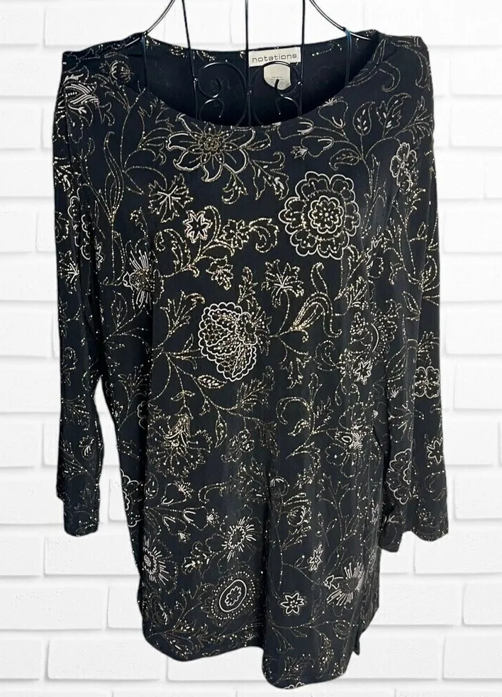 Notations Women's L Black & Gold Floral Stretch Glitter Evening Whimsigoth -Sparkly Evening Top -Floral Pattern -Stretchy Size: Large Color: Black Body: 94% Polyester and 6% Spandex Preowned - On one sleeve some pulls on the thread pictured Approx Measurements Pit to pit: 20 1/2 Length: 25 3/4