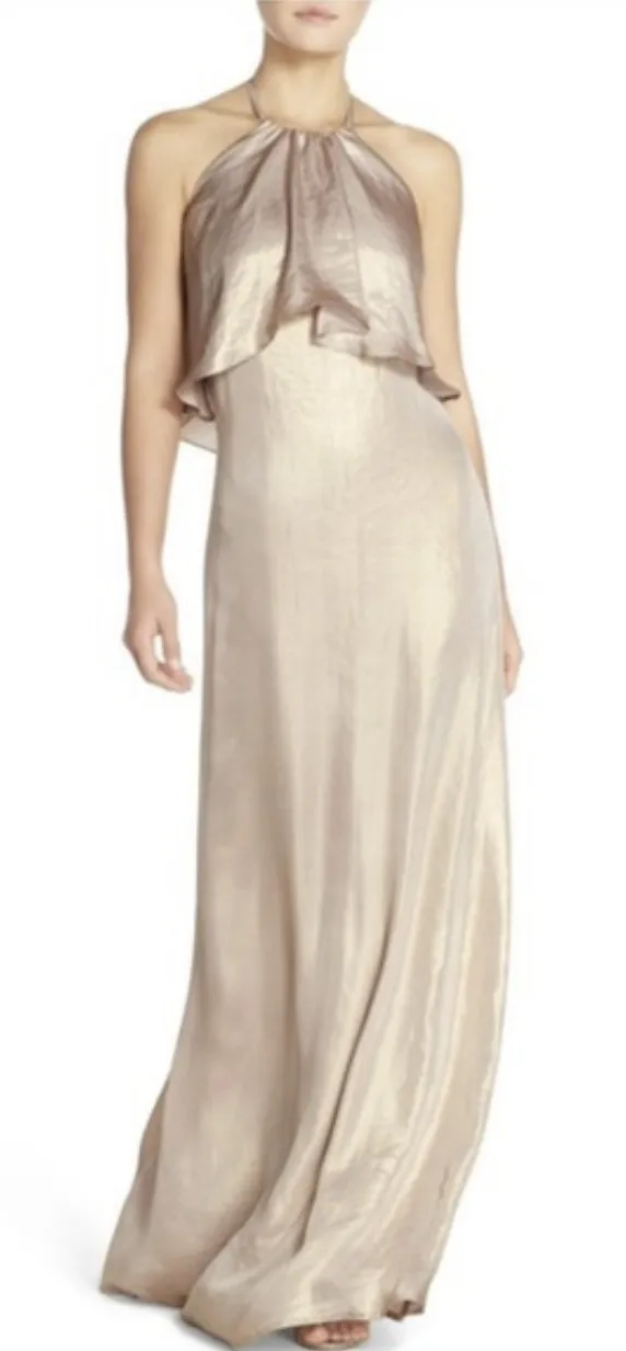A wide, fluttery ruffle drapes the back-baring halter bodice of this luminous liquid chiffon gown that flows down the figure to a dreamy, floor-sweeping hemline. Ties at nape. High halter neckline. Midweight non stretch fabric. 100% polyester
