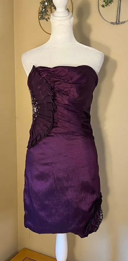 Chic! Sexy purple strapless dress with decorative pleats as well as rhinestones, beading, and sequins. Lots of ruching, and the bust is lightly padded. Zippered back. Lined Dress: 100% Polyester Lining: 100% Polyester Dry Clean Womens XS Please see photos for approximate measurements. KR / T