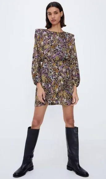 Zara - Purple/Black Paisley Print DesignKeyhole Back Mini Dress -Round Neck with Shoulder Pads - Lo... Show more