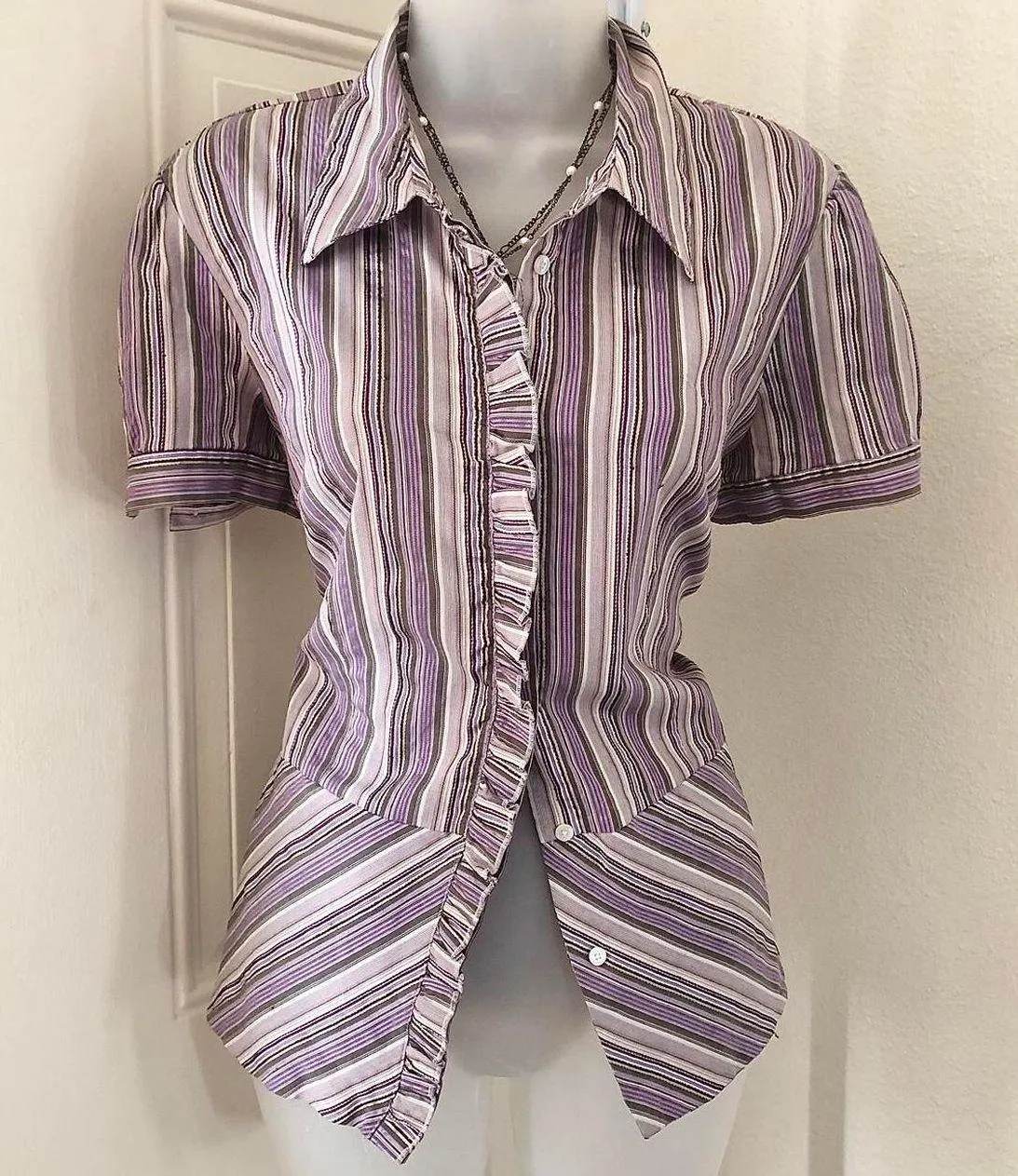 2000s Y2K purple white striped short sleeve fitted button up down shirt top blouse ruffle front office siren core -XS Measurement in pics Size XL - $34 (29% Off Retail) - From Victoria