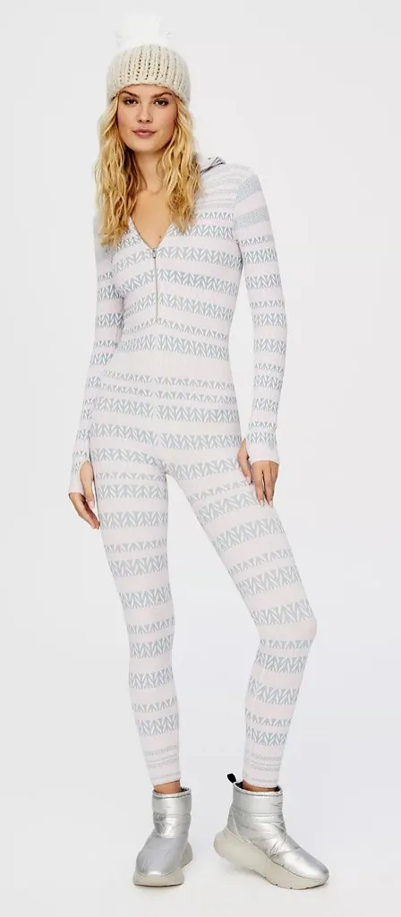 RARE!!! NWT Free People Movement Ski Bunny Onsie $148MSRP Size: M/L super stretchy 11 inch stretch to 17 inch Length from shoulder 46 inch Inseam 23 inch You’ll be a true ski bunny in this formfitting knit onesie featured in a wintery striped design with a zip-up hooded neckline. Slim fit Thumbholes at sleeves Stretch knit Please note stock photo is to show style and outfit inspiration same inside without hood and in a different print I am selling the black and grey one ! No refunds or cancellations