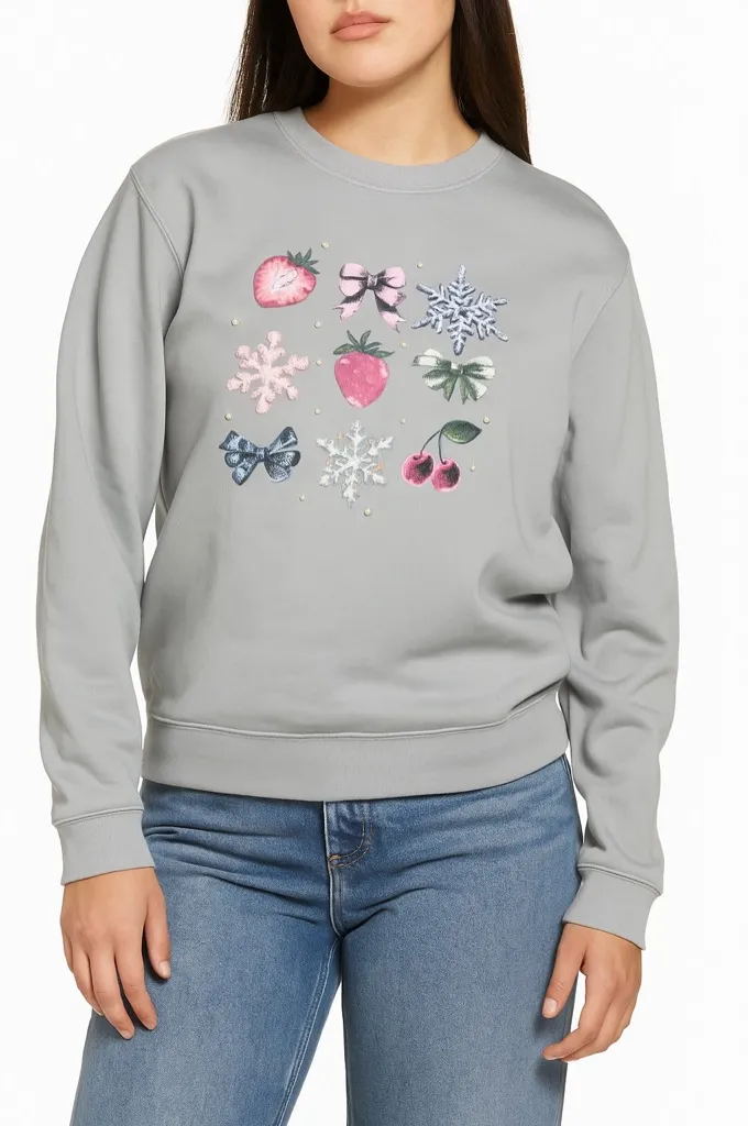 Cozy gray sweatshirt featuring festive graphics in pink, blue, and red. Add a touch of charm to your everyday look with this soft gray sweatshirt featuring embroidered bows, strawberries, cherries, and snowflakes. Perfect for cozy days, casual outings, or gifting to someone who loves unique, feminine styles. Hashtags: #CuteSweatshirt #CozyStyle #GraphicSweatshirt #CasualOutfit #GraySweatshirt #TrendyPullover #AestheticClothing #WinterStyle #KawaiiFashion #StreetStyle #ComfyChic #OOTD #ShopSmall #WomenFashion Embroidered Sweatshirt Oversized Fit Fleece lined Crewneck/drop shoulder 80% organic Cotton/ 20% recycle polyester