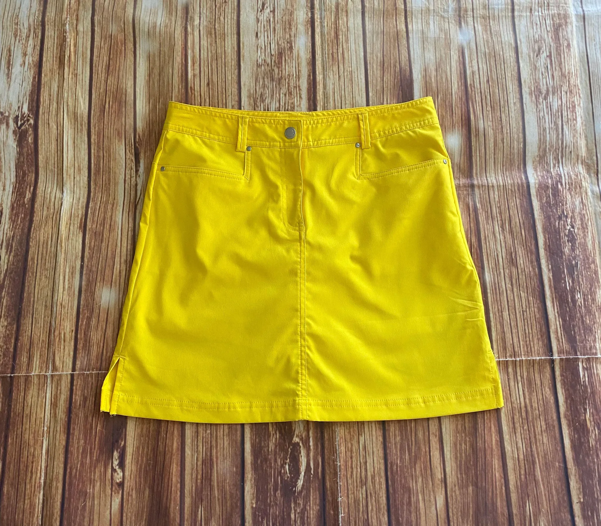 Very nice and comfortable N’vo by Lancot Women's Yellow Skirt, Double Layered Shorts, Button and Zipper Closure, Size 4. Condition is Pre-Owned!! Disclaimer: The Skirt has some stain on front and shorts have a little stains, you can see in the pictures. Please see the pictures for measurements and details.