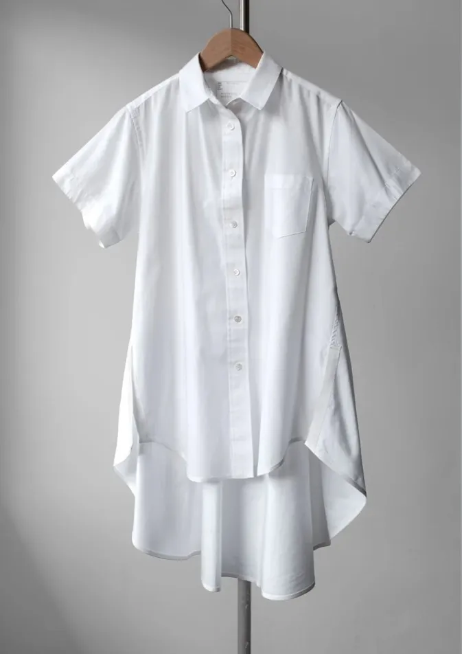 Excellent preowned condition Sacai size 1 which converts to women’s US size 6. Cotton poly blend short sleeve oversized, loose fit, flare hem button front shirt. Side slits. Keywords: Japanese street style, streetwear, workwear, oversized, contemporary, minimalist, professional, tunic, long line, modest