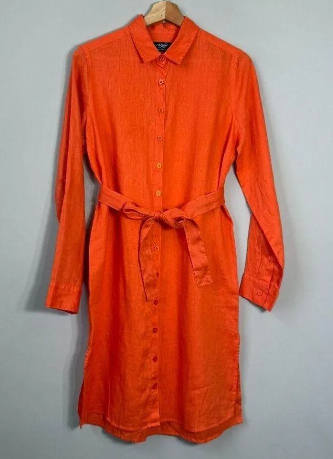 This NWOT 100% Linen Button Up Shirt Dress by Free Line Athens is a stylish and chic choice for women in size small. The dress features a solid orange color with a collared neckline and long roll tab sleeves, perfect for various occasions like travel, weddings, parties, or casual wear. Its A-line silhouette and knee-length make it flattering and versatile, while the button closure and bow accents add a touch of elegance. Made from lightweight woven linen fabric, this dress is ideal for the warmer seasons of spring and summer, offering a comfortable and stylish option for any outdoor or city event. Condition: BRAND NEW WITHOUT TAGS (never been worn)! Size: Small, S Material: 100% Linen Measurements (taken while garment is laying flat): Underarm to Underarm: 21" Waistline: 20" Top of Shoulder to Bottom Hem: 36" Side Slit: 8.5" Ships FAST, within 24 hours of order placement! Preppy Bohemian Boho Colorful Travel Vacation Dressy Woven Timeless Classic Beach Coastal Lightweight Breathable Minimalist Party Business Casual Office Professional Career Event
