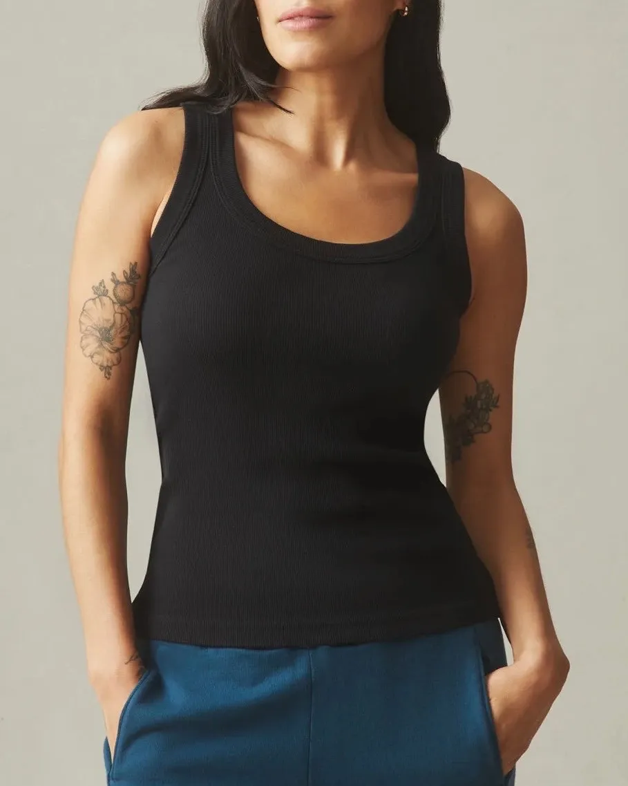 The classic rib tank, refreshed. A staple in every wardrobe, this updated version is made from midweight rib cotton with a touch of spandex for the perfect fit. Designed with a deep U-neckline and bra-friendly straps, it's ideal for layering in spring and wearing solo all summer long. Fitted, designed to sit close to the body No ease, meaning no extra room Contours to the body for a snug, streamlined look New without tags. Keywords: American Giant, women's tank, black tank, scoop neck, ribbed, casual wear, layering, basic. Brand: American Giant Size: L Color: Black Department: Women Type: Tank Material: Cotton, Spandex Neckline: Scoop Neck Pattern: Solid Fit: Regular Country of origin: United States Garment care: Machine Washable