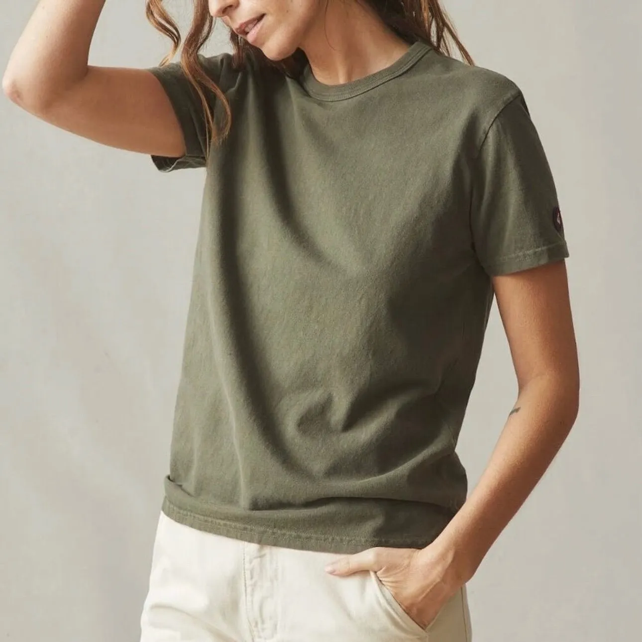 The Vintage Short Sleeve Crew Tee is made from 100% cotton jersey, that's then treated with a pigment dye. The result offers a worn, vintage look and feel. Features an embroidered AG patch on the left sleeve. Made in Los Angeles. Pigment-dyed for a vintage-inspired look with unique color variations, especially along the seams. New without tags. Keywords: American Giant, women's T-shirt, green, washed olive, casual wear, crew neck, short sleeve, basic style, layering. Brand: American Giant Size: XS Color: Green/Washed Olive Type: T-Shirt Department: Women Style: Basic Material: 100% Cotton Neckline: Crew Neck Sleeve length: Short Sleeve Pattern: Solid Fit: Regular Occasion: Casual Garment care: Machine Washable Country of origin: United States