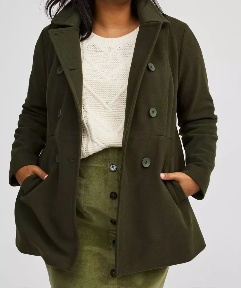 Chic and cozy dark green pea coat. Features double-breasted design. Ideal for versatile styling.
