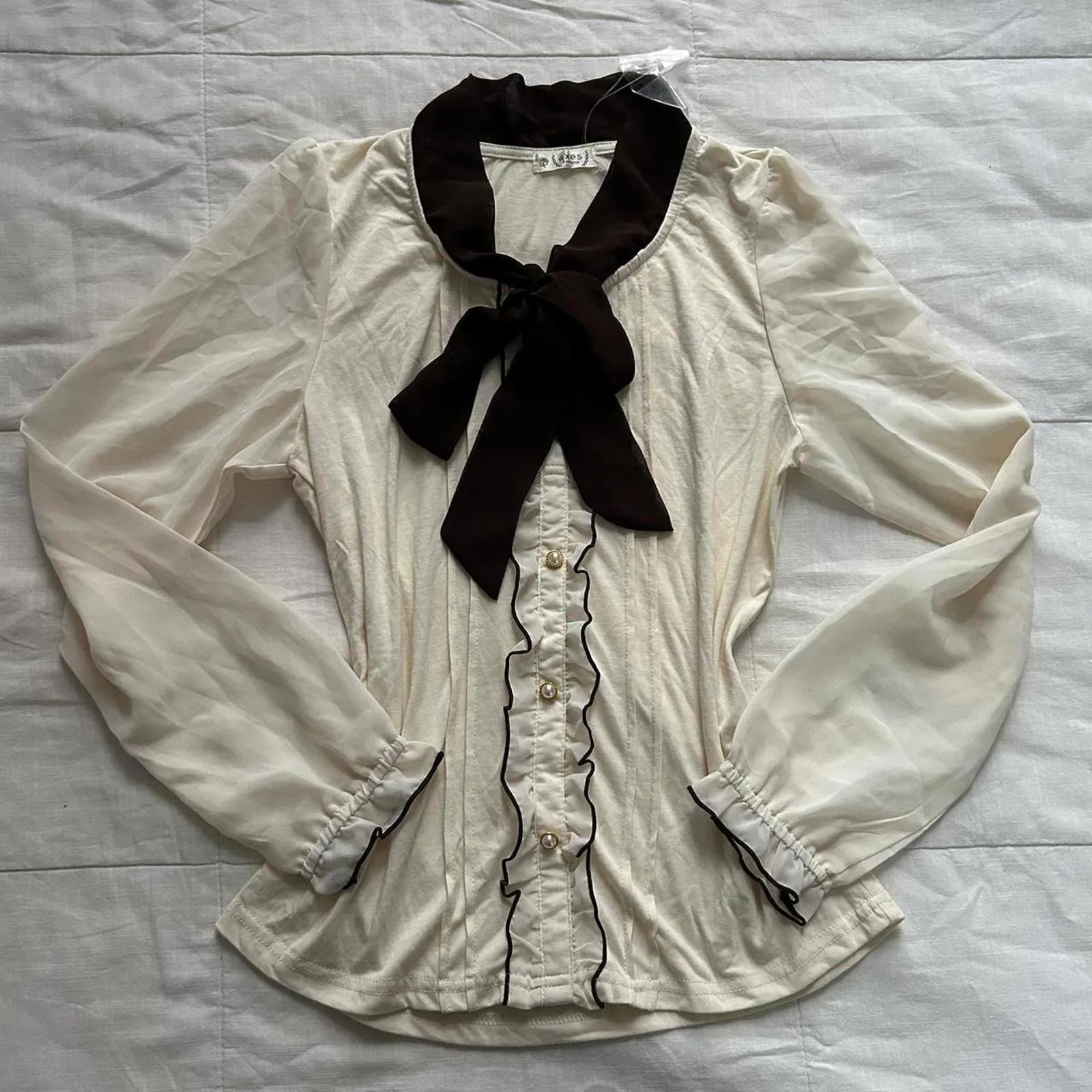 NWOT Axes Femme Cream and brown bow neck long sheer sleeve blouse with ruffles Size M - $55 - From Killah