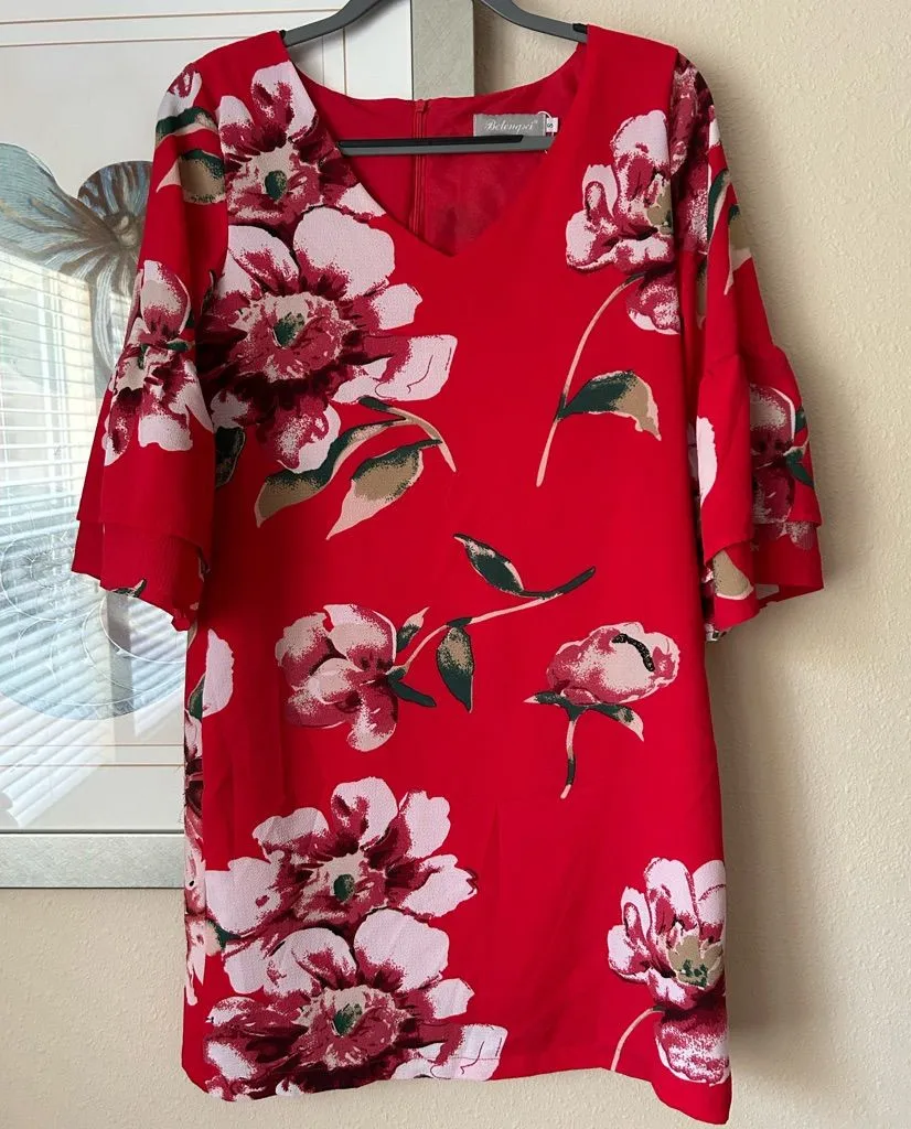 NWOT Belongsci Floral V-neck 3/4 Ruffle Bell Sleeve Shift Dress Red - $15 - From Jenna